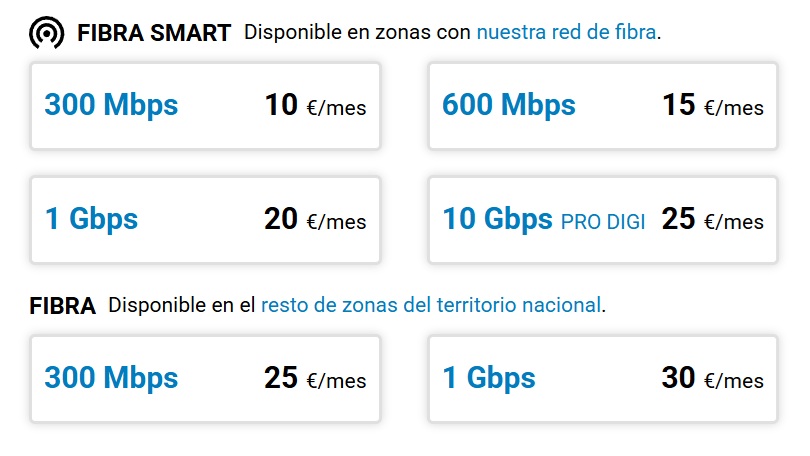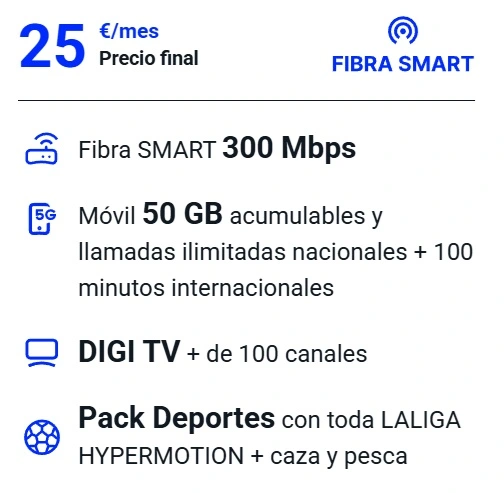 Desde solo 10€ al mes IVA incluido (fibra Smart, en las zonas con red DIGI). Además, al contratar la fibra de DIGI, tus líneas móviles ¡bajan de precio!. Y como siempre, sin sorpresas en la factura. Para que no te lleves ningún susto.